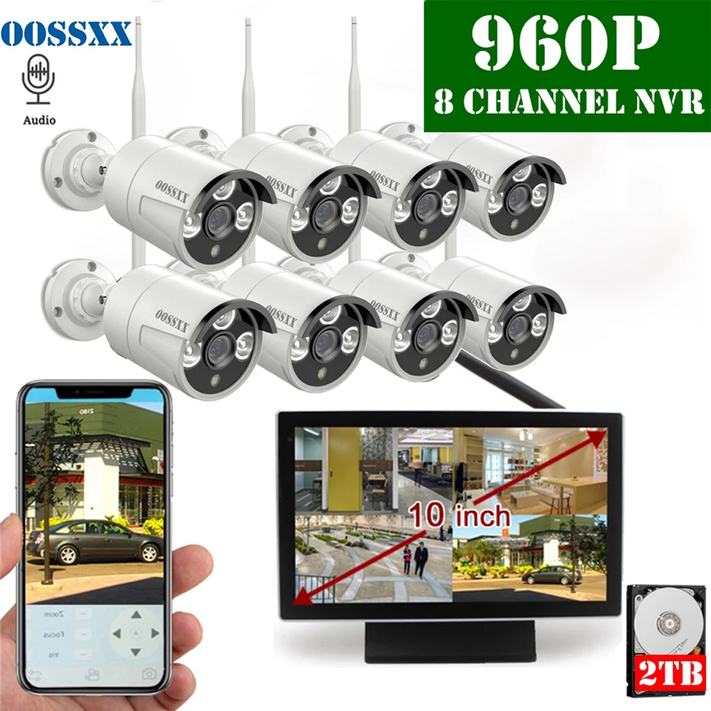 BEST OOSSXX 8CH 1080P Wireless NVR Kit 10' Monitor Wireless CCTV 8pcs 960P Audio Indoor Outdoor IP Camer