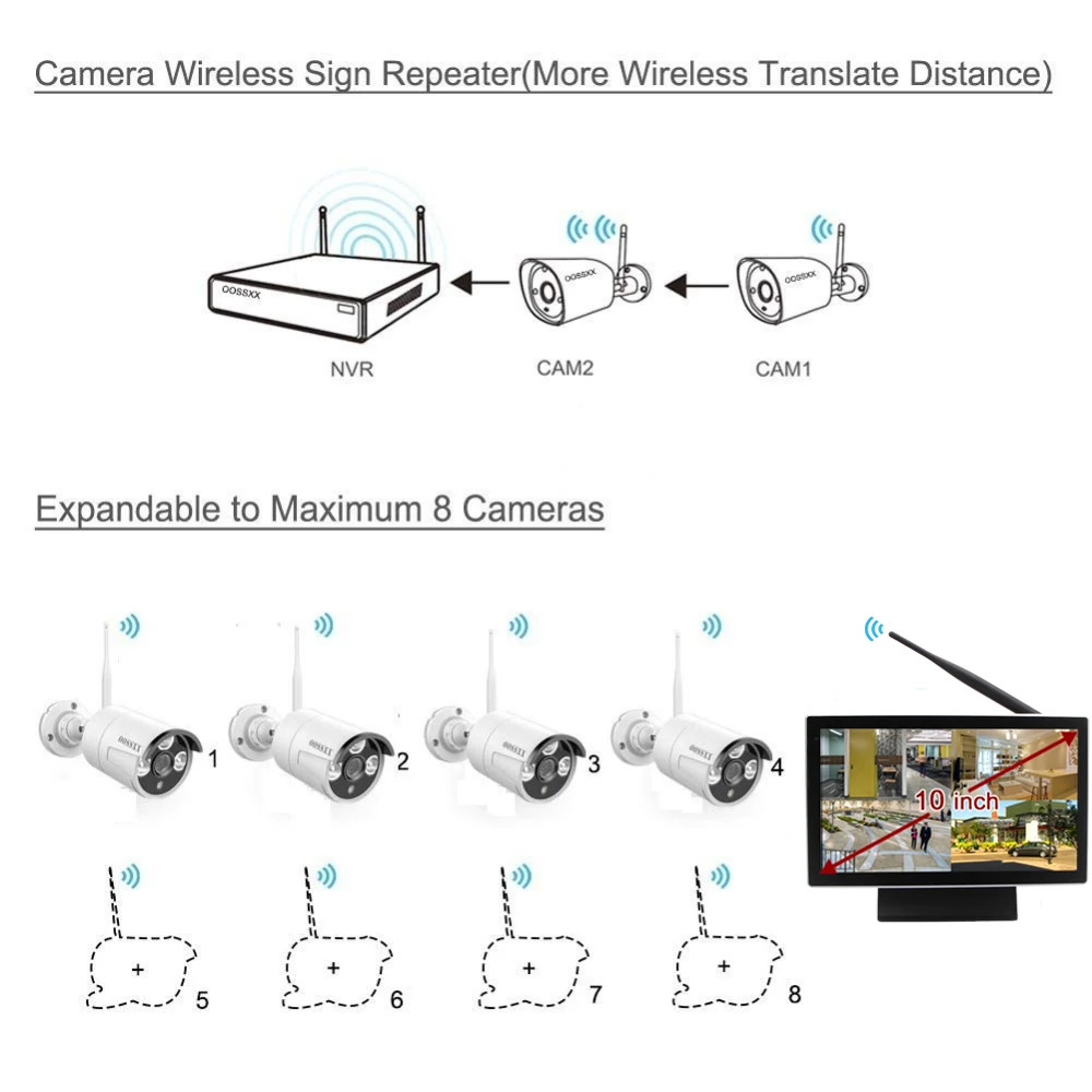 OOSSXX 8CH 1080P Wireless NVR Kit 10' Monitor Wireless CCTV 8pcs 960P Audio Indoor Outdoor IP Camer